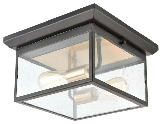 Two Light Flush Mount Matte Black/Brushed Brass Finish with Seedy Glass . 2-Light Flush Mount in Matte Black with Seedy Glass. The Delamere Ridge outdoor flush mount updates historic design with bold Brushed Brass accents which cast a warm glow against the Matte Black finish. The collections low profile design fits snugly against any facade. Features: Product Type: Outdoor Lighting Flush MountGood For Outdoor: YESMaterial: Brass Glass SteelStyle: Modern / ContemporarySub Style: Urban / Industrial / Southwestern Safety Rating: ETLCertified For Locations: WetBulb Included: NoDimmable: YesBackplate/Canopy Dimensions (inches): 12x12Cord Length (inches): 8 Shade Shape: Square Shade/Glass Materials: Glass