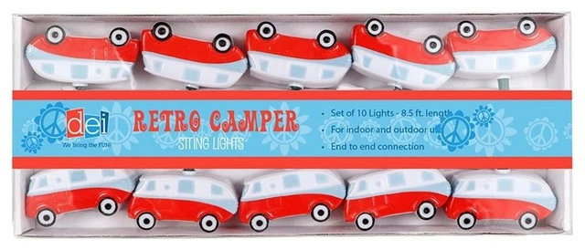 These Retro Look Red and White Camper Electric String Lights work well as quirky decor in your home all year long or as fun party decor. Use them to decorate indoors or outdoors- the decorating possibilities go on and on! You could also buy them as a fun gift for any friend or family member who owns their own camper- or who dreams of owning their own camper.. Measures 8 1/2 feet long green wire. Each camper measures 3 x 2 x 1 1/4 inches. Set of 10 lights, indoor and outdoor use, gift boxed. UL approved, end to end connection. Made by DEI, imported