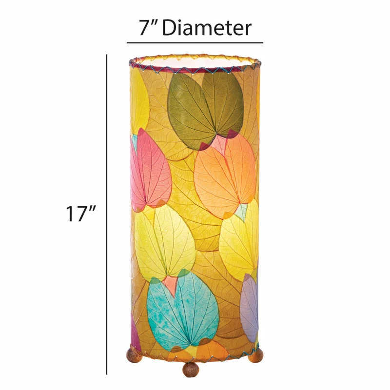 Features overlapping fossilized alibangbang leaves that are hand placed onto a standard UL lampshade backing using a non-toxic adhesive, laminated and formed into a cylinder shape. The shade is handstitched onto a powder coated, wrought iron frame and uses wooden finials as feet.