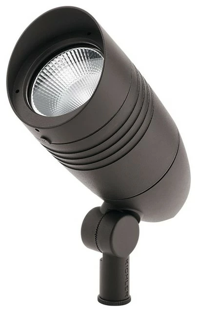The Kichler C-Series 21W, 33-degree Commercial Outdoor large accent light is an integrated LED fixture that features 120V-277V Universal voltage with built in surge protection and is rated for wet locations. Featuring an integrated cowl, durable knuckle construction, and an all-metal housing with a textured polyester powder coat finish (shown here in Textured Architectural Bronze), it is designed for high use wear and tear.