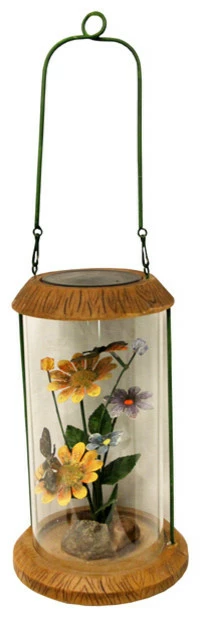 Inside of lantern features painted metal flowers along with rock and gem accents