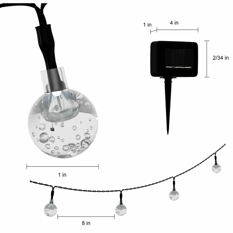 PRODUCT DETAILS- 30 Bulbs total measuring 22 feet in length. Each bulb = 1 diameter. Lead wire 3 feet long from solar panel to first light. Battery; 1xAA NI-MH 1.2V/ 400 mAh. Solar Power: 2V/70mA Crystalline Solar Panel