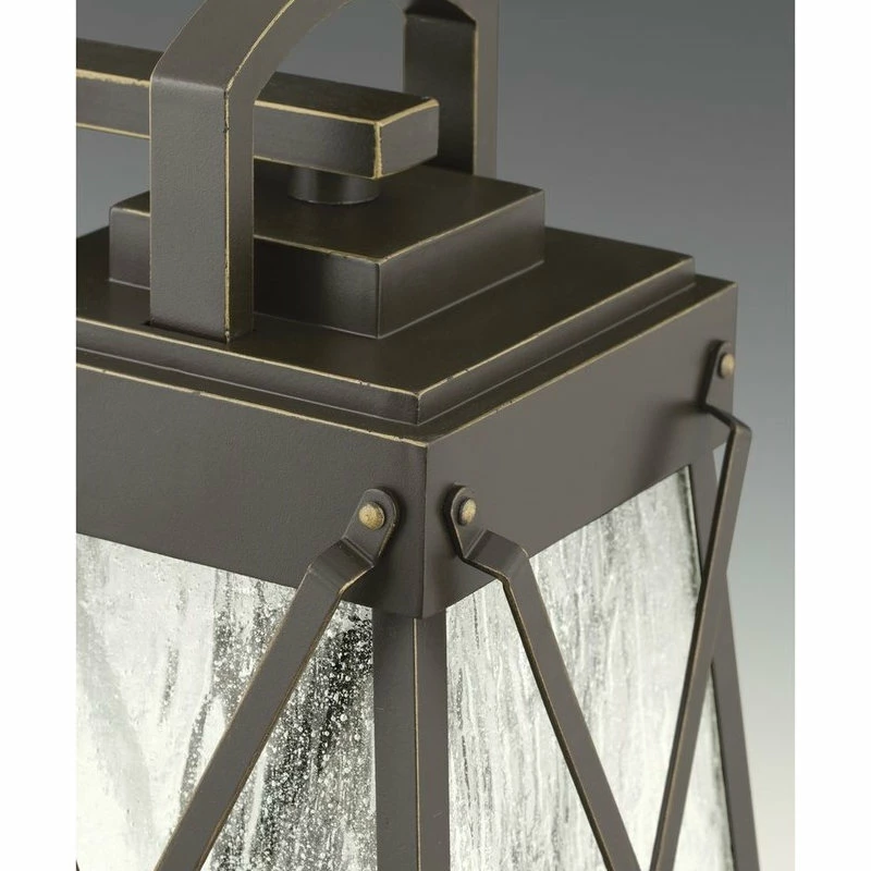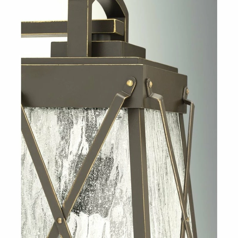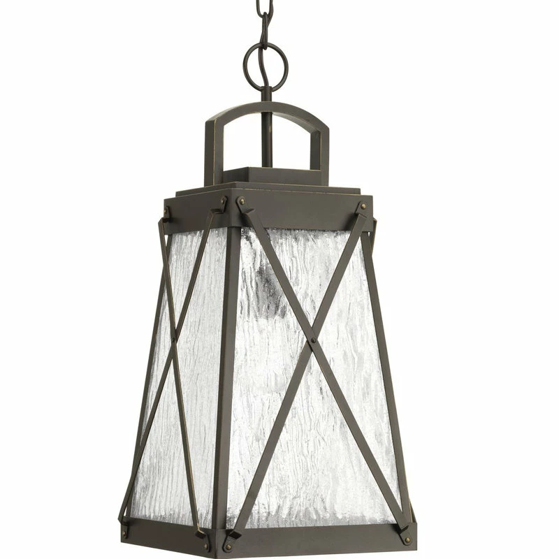 A cottage-inspired outdoor lantern collection with a tapered cage. Creighton features clear water glass clear and Antique Bronze or Black finish options. The frame’s linear details are riveted to enhance mechanical detailing of the fixture. Wall, post and hanging lantern options available.
