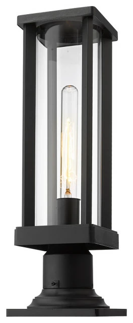 From the Glenwood lighting collection comes this outdoor pier mounted fixture perfectly suited for placing on top of columns leading down the driveway or along a patio railing. Encased in a sleek modern aluminum frame this lighting piece features a cylindrical clear glass lantern to allow the bulb to brighten the dimmest paths. With a deep black finish this pier mounted lantern fixture works pleasantly with any architectural styles and elements.